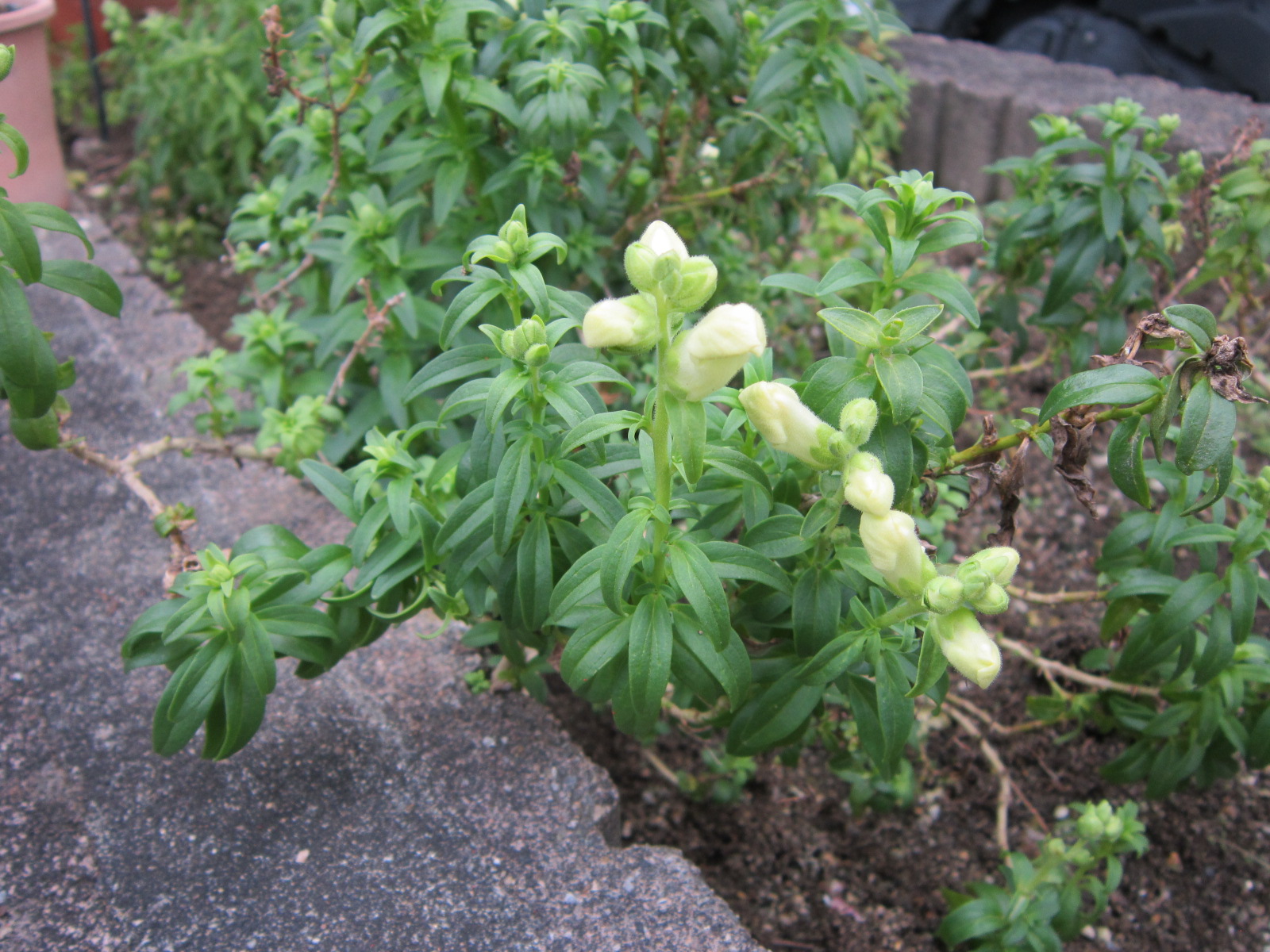 新たに別のところからこぼれた種から芽が出て咲きます。雑草並みの繁殖力です。その一方で、勢力拡大していた大きなキンギョソウは、一定の役割を果たしたかのように枯れていきます。枯れたあとには、別のキンギョソウを移植してあげよう。。。