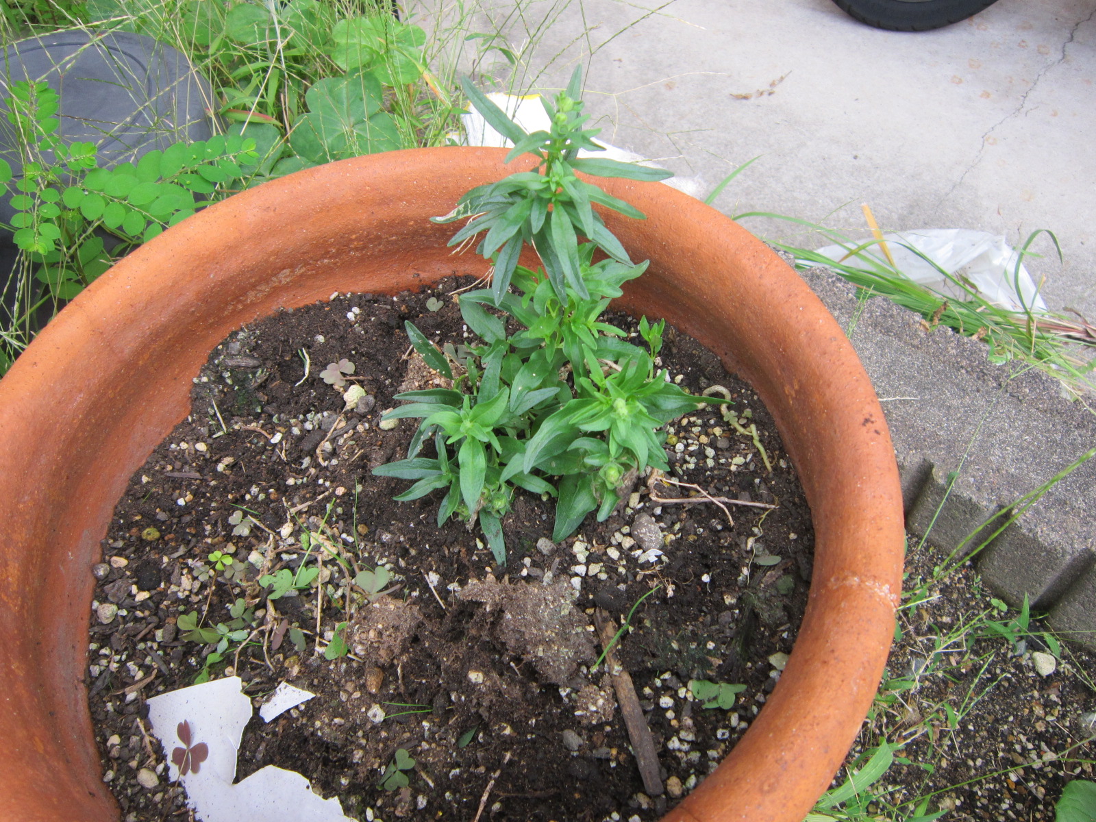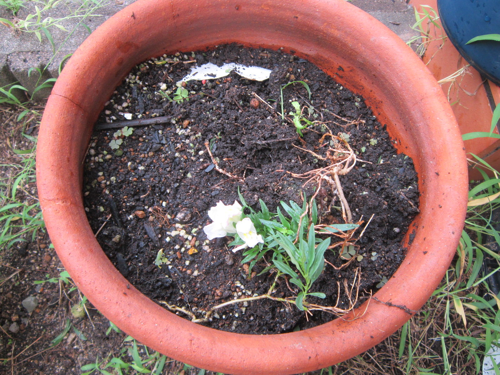 キンギョソウはいったん枯れてしまいました。枯れた種は、ブチッと抜いて下に落としました。また、そこから咲かないかな?