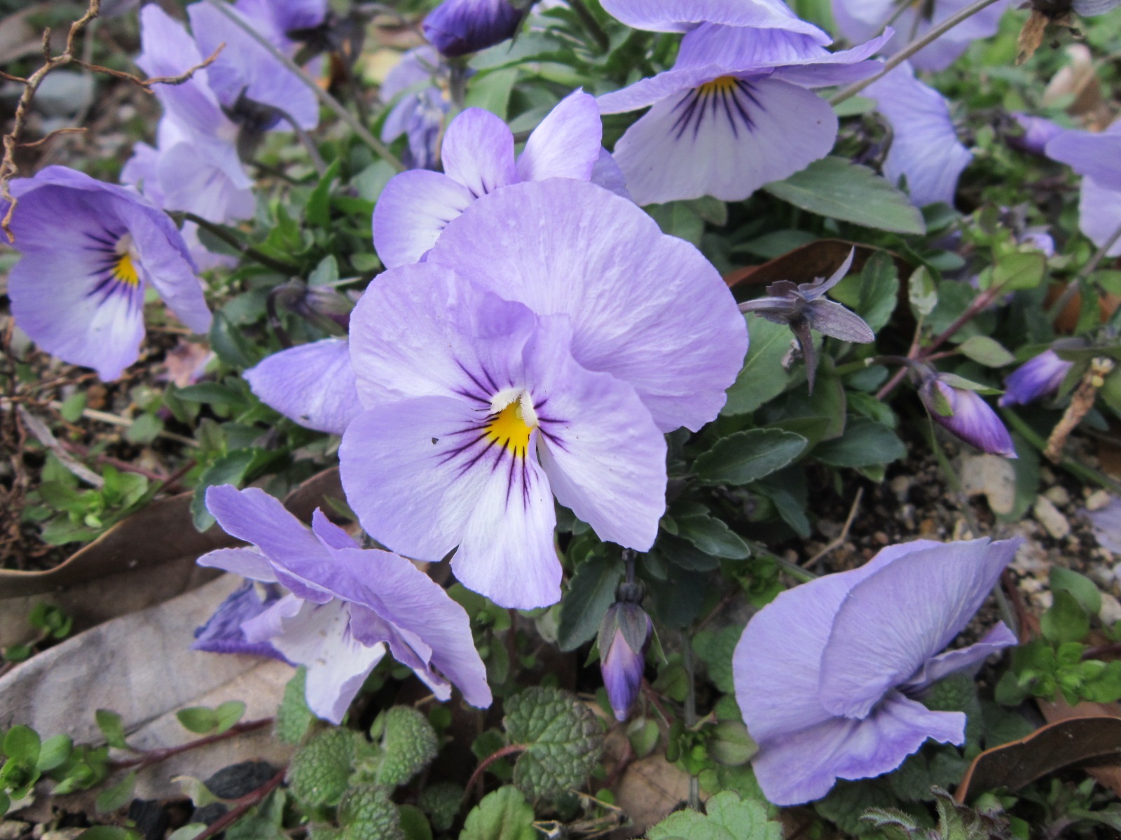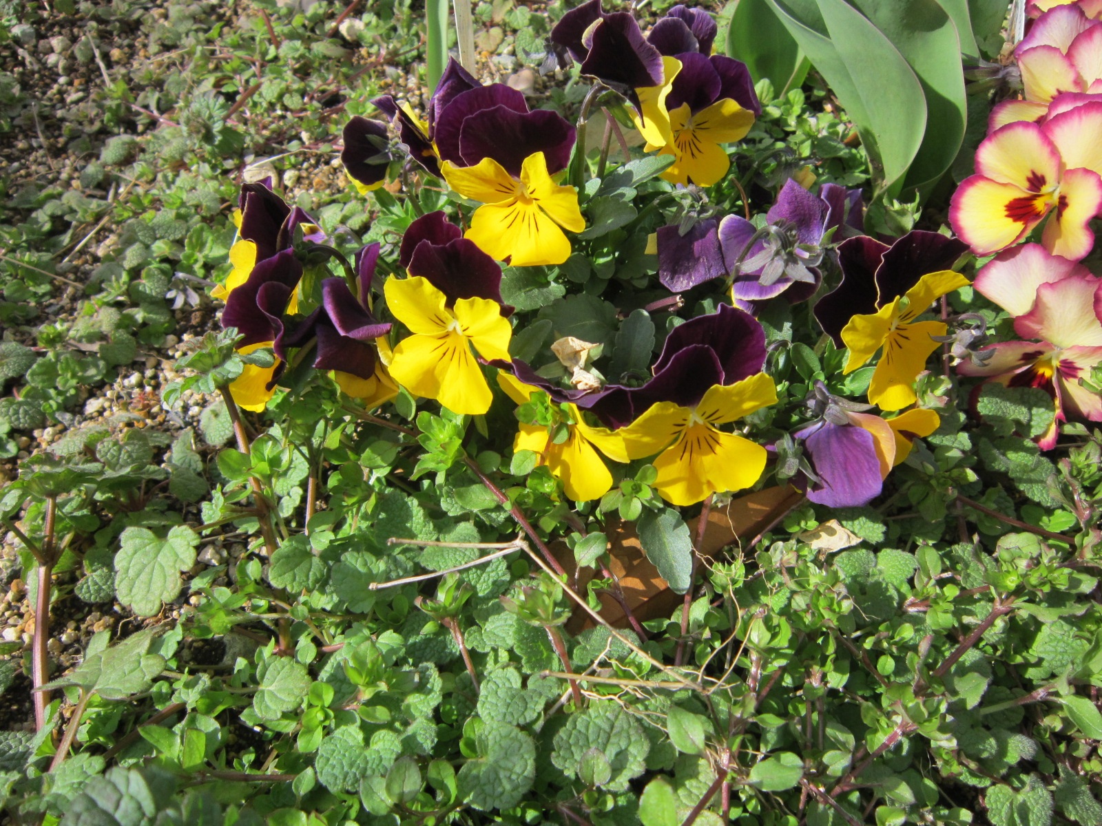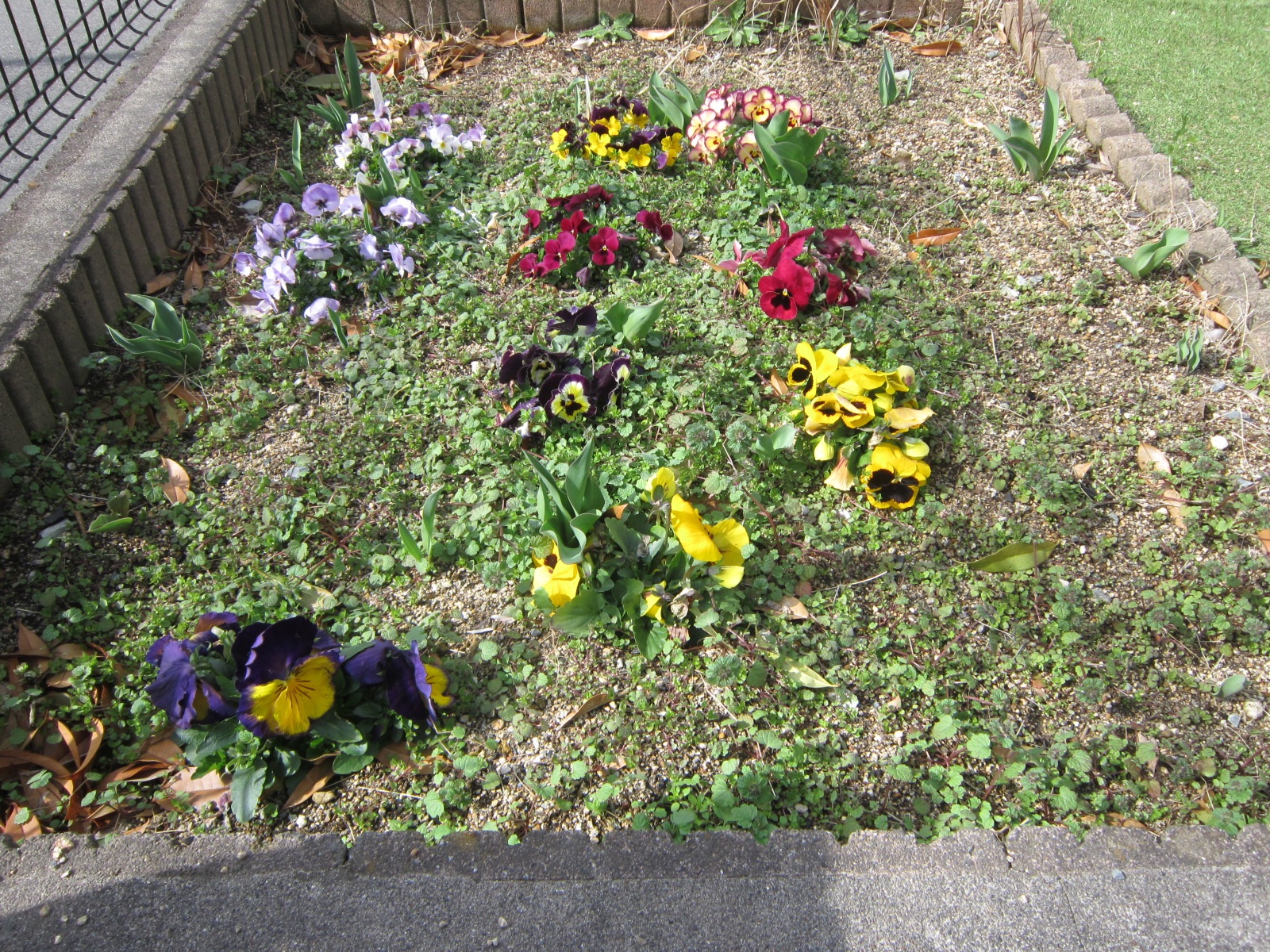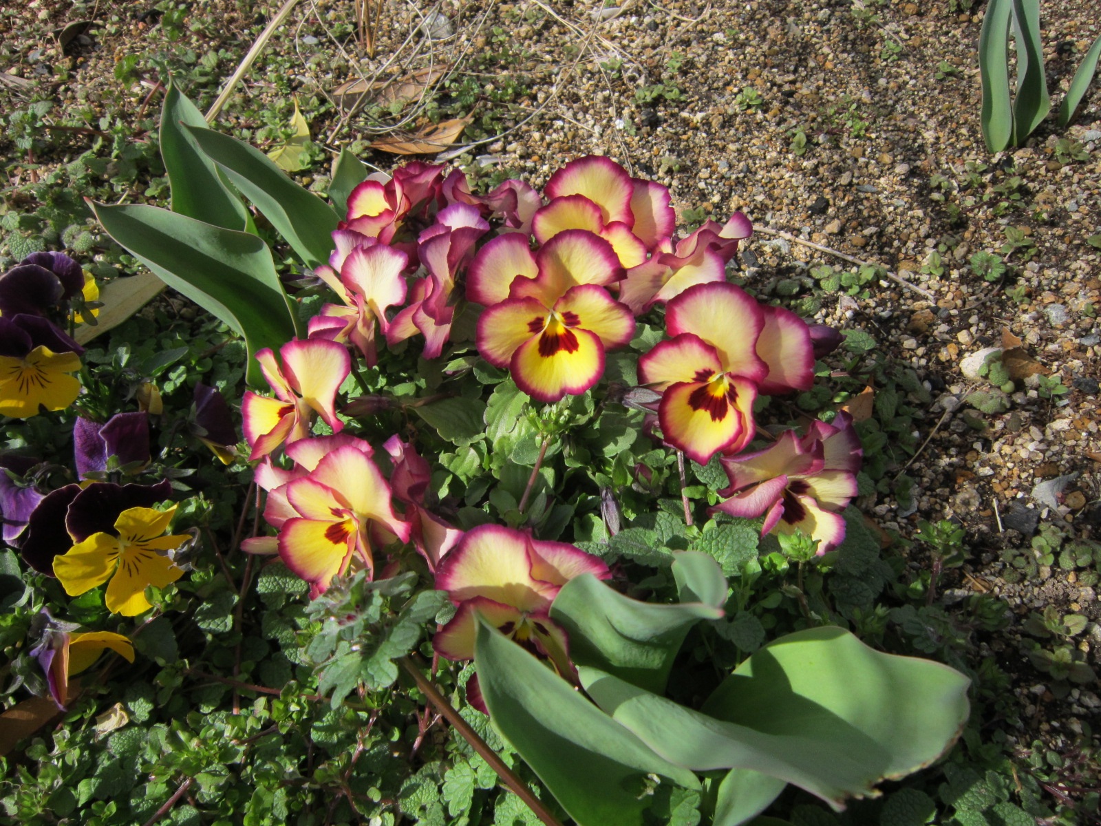 一輪一輪が綺麗です。定番の物から変わったものまで。そして、その隙間からチューリップの芽が出てきています。チューリップは咲かないでしょうねぇ。多分ですけれど。