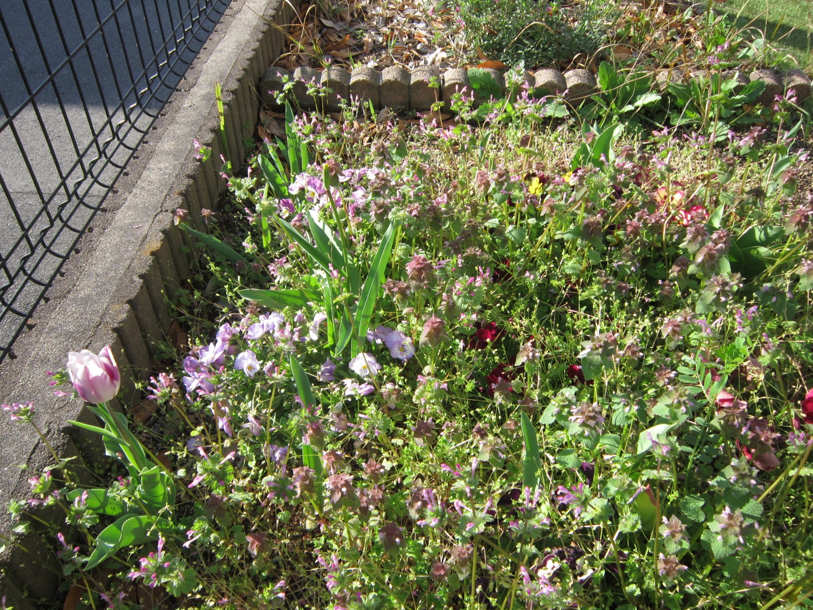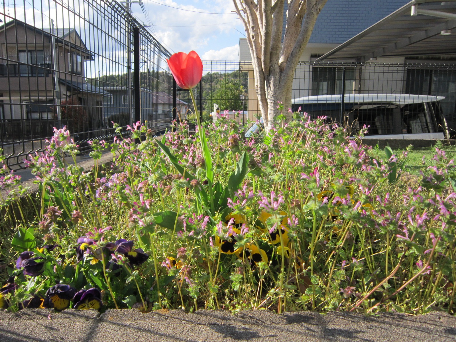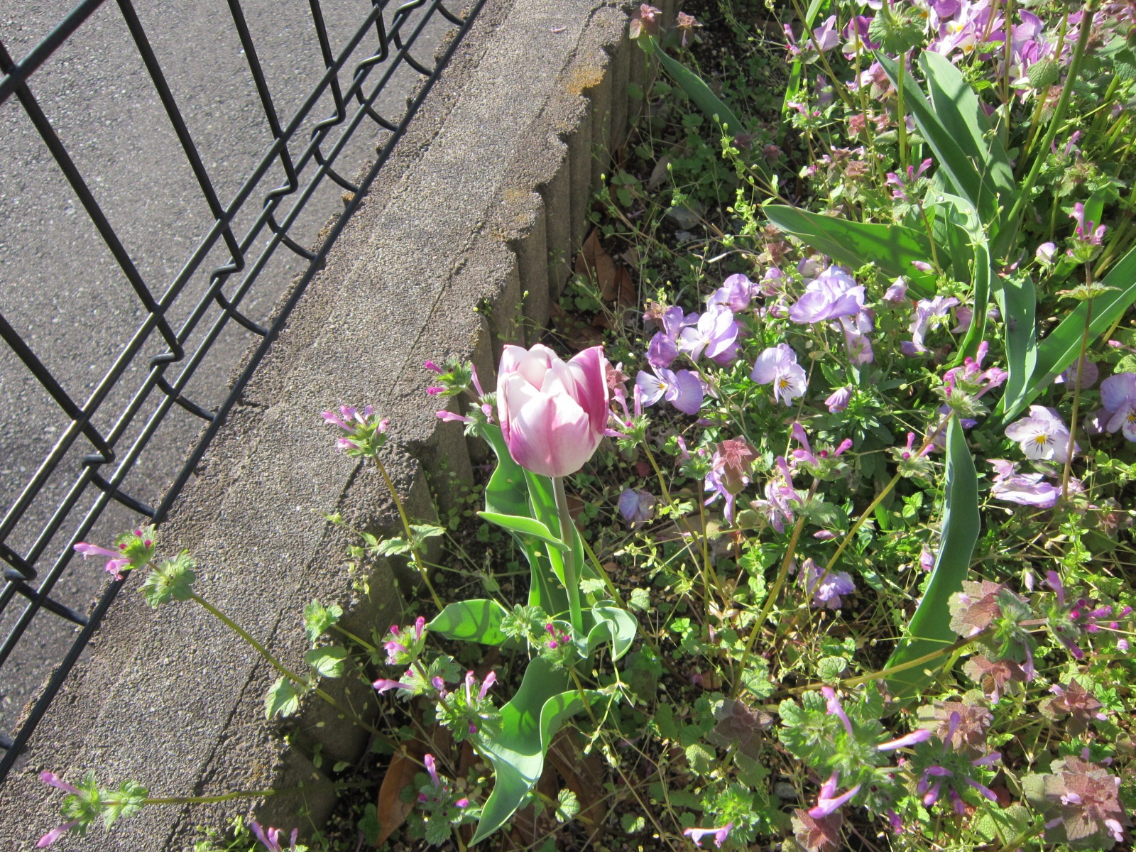 昨年のチューリップ後始末したとき、球根まで取れなかったものもあったので、そのままにしたら春になって芽が出て咲きました。いやはやビックリ。来年も咲くかどうか試してみようと思います。すっかり仏草に埋もれてパンジーが見えません。引っこ抜きたかったのですが、そこまでの気力はありませんでした。来週になったら抜こうかなぁ?