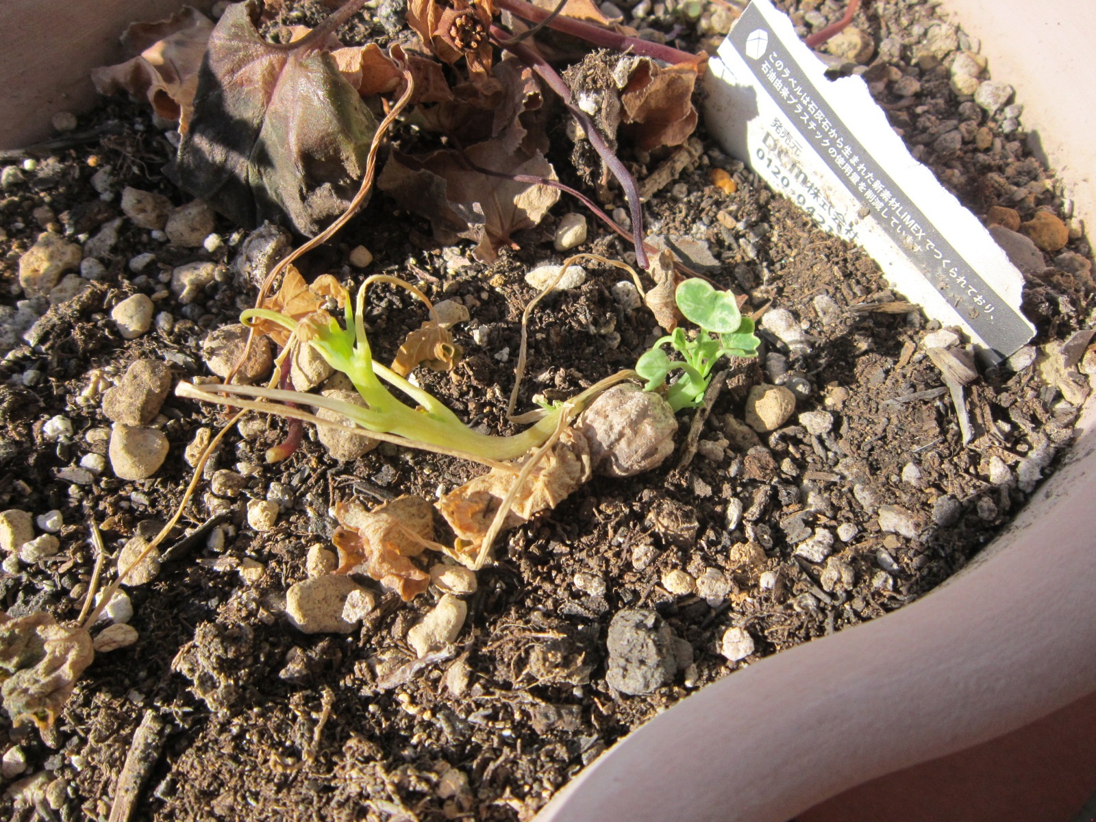 ガーデンシクラメンは終わりですね。夏越せる方法があるのですがチャレンジしてみます。そして、キンレンカも一度は枯れたのですがその後新たな芽が出てきています。種がもろに出ているのでこの後埋めてやりました。