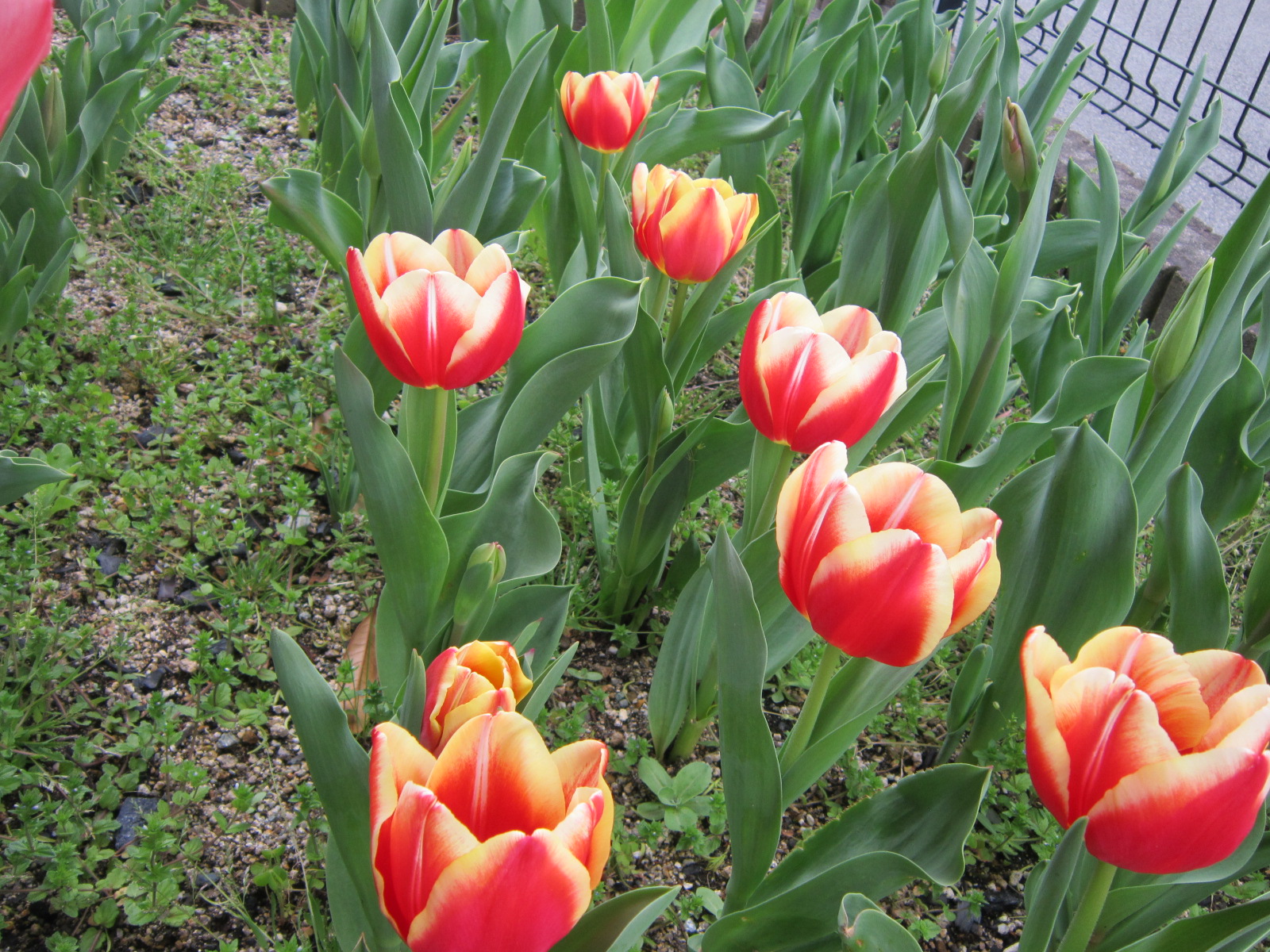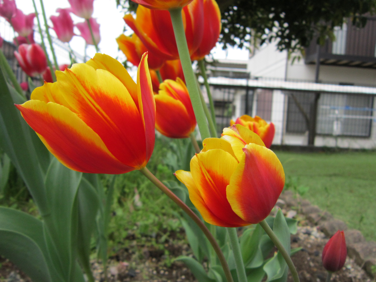 夜半の雨で先に咲いていたチューリップが終わってしまいました。黄色のチューリップもそろそろ終わりを迎えているみたいです。2色咲きはこれからと言った感じですね。3枚目の写真では、先週からあまり変化有りませんが、手前の朱色はそろそろ終わりそうですね。