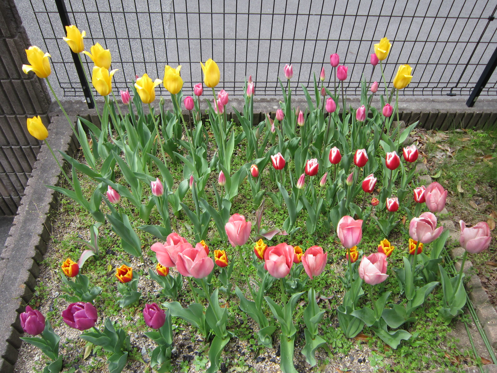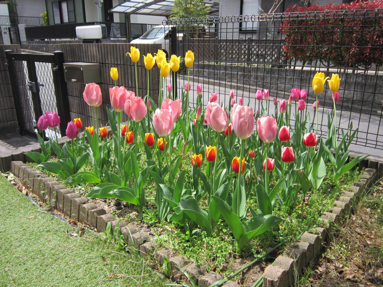 まだ、満開ではありませんが、半分ほど咲きました。来週くらいには、満開になりますかね。でも、一部のチューリップはそろそろ咲き終わろうとしています。